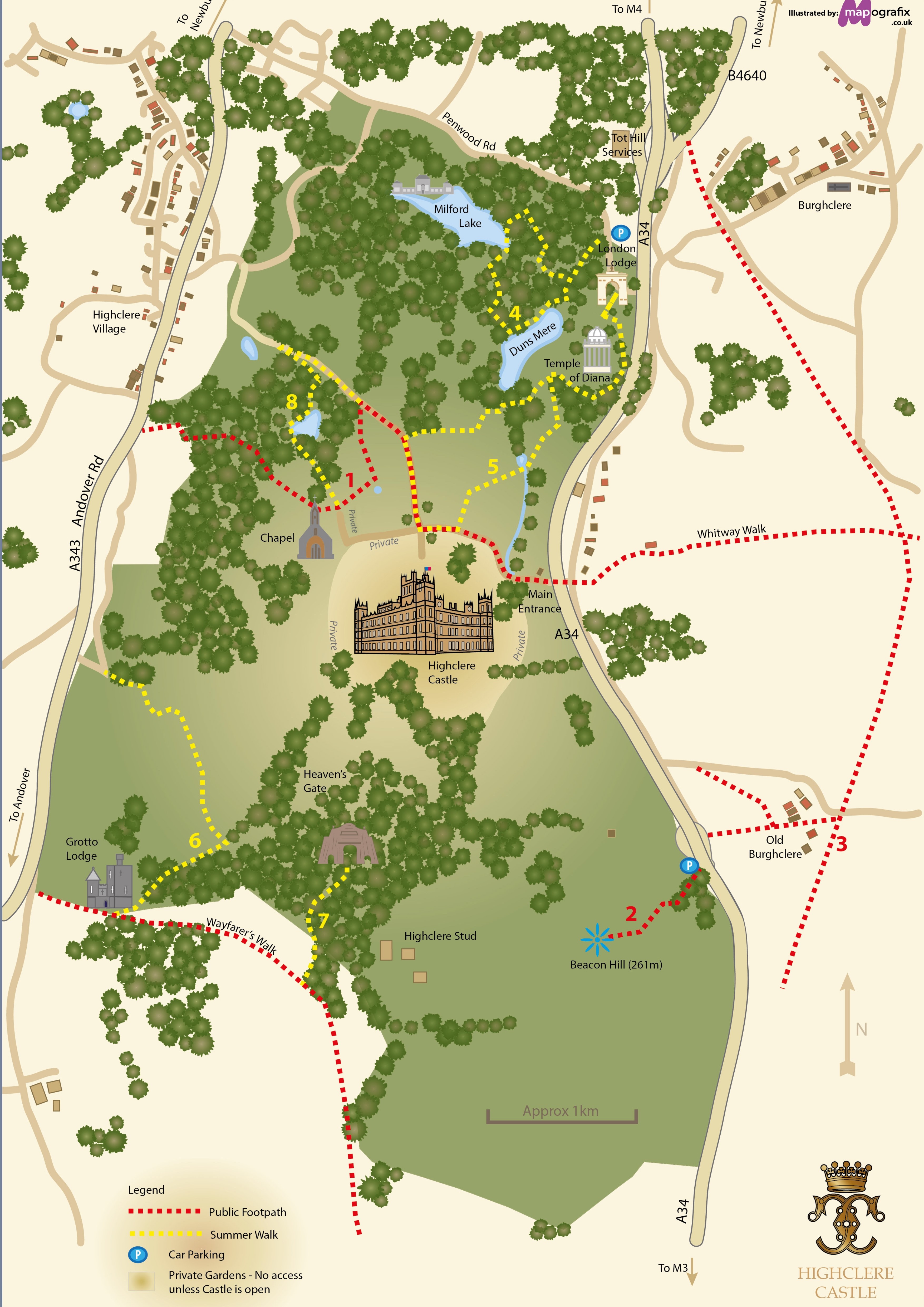 Although Highclere is only 60 miles from London as well as being near large towns such as Newbury, the park and farm are set in some spectacular countryside. The gardens and grounds are only open when the castle is open but there are a number of public footpaths which are open throughout the year as well as summer walks which are detailed on the maps below. Please do keep your dogs on a lead at all times, there are ground nesting birds, rare flora and fauna, as well as sheep.